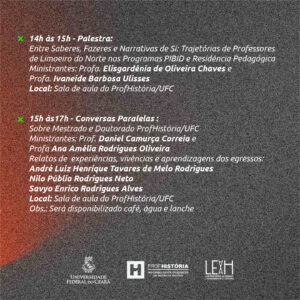 - Auditório da História – UFC/CH II (das 8h30 às 11h30)